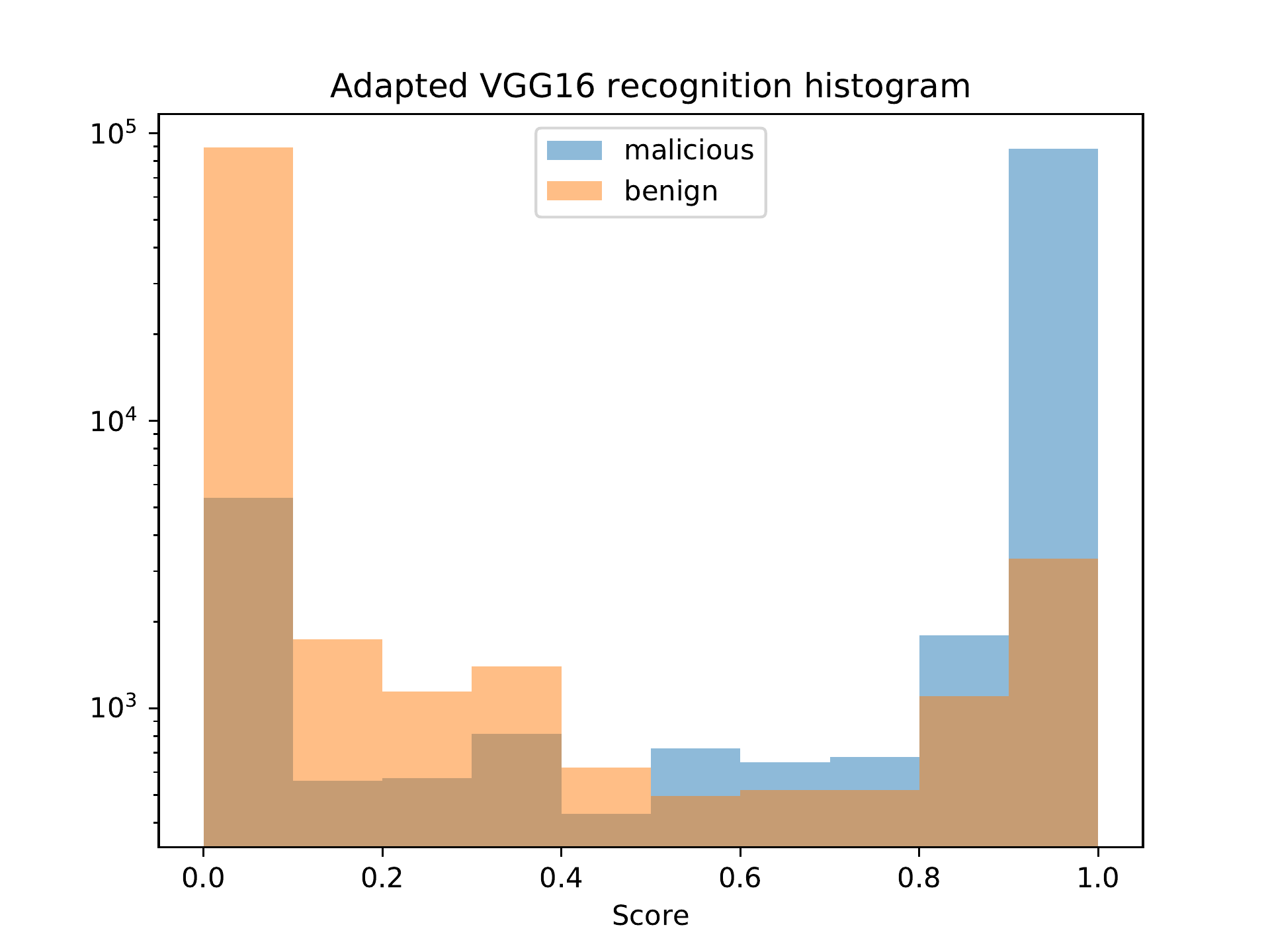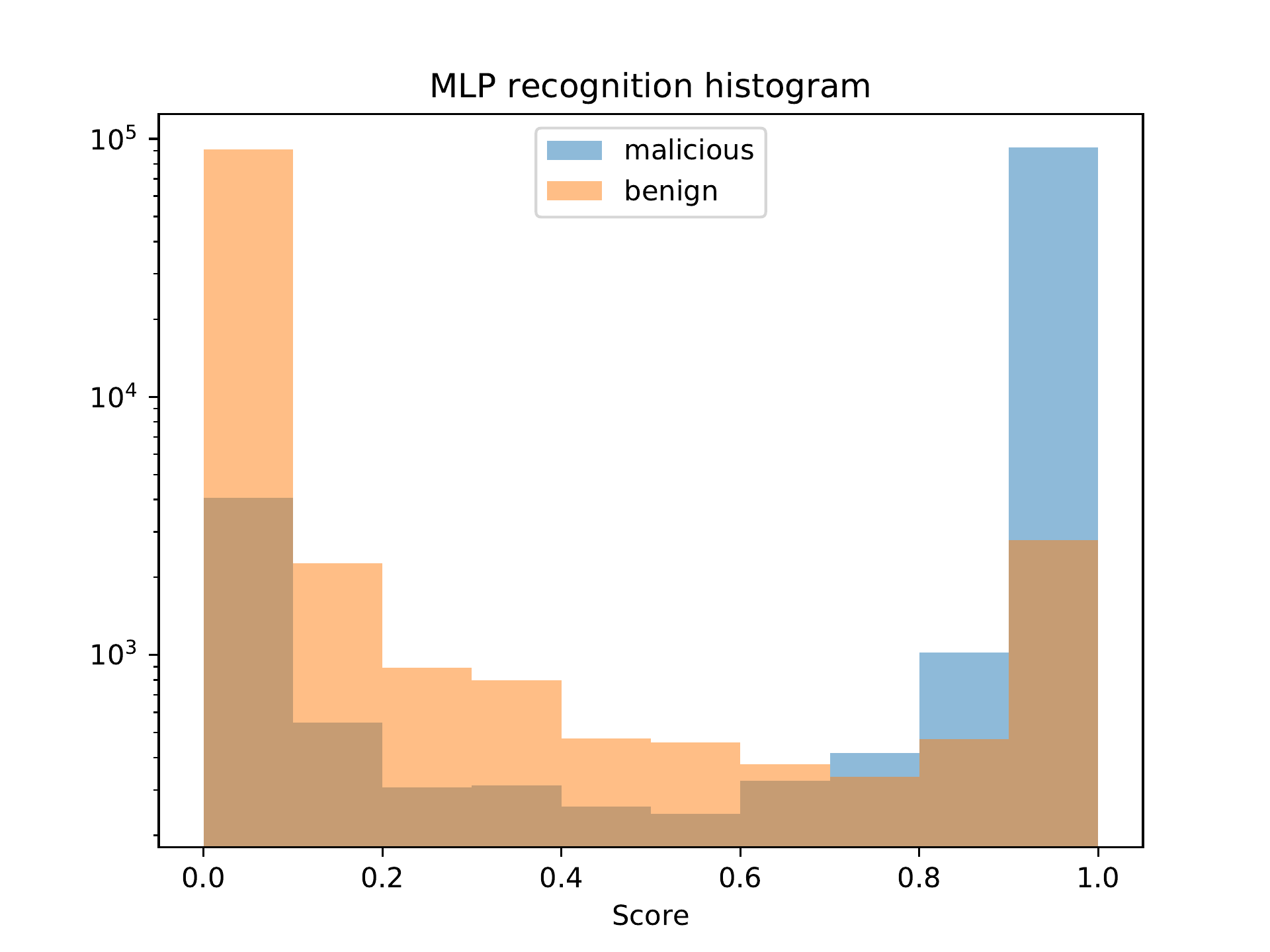 Figure bo shows the classification distribution for the MLP model which classified the raw data from the data set. We can see that the model classified most samples as positive (the output value for most samples was 0.5). This is the reason why this model has the highest recall in Table bk. However, the precision is very low, and since the data set contains an equal number of benign and malicious samples, the accuracy is close to that of a random classifier, which is exactly 50%.
