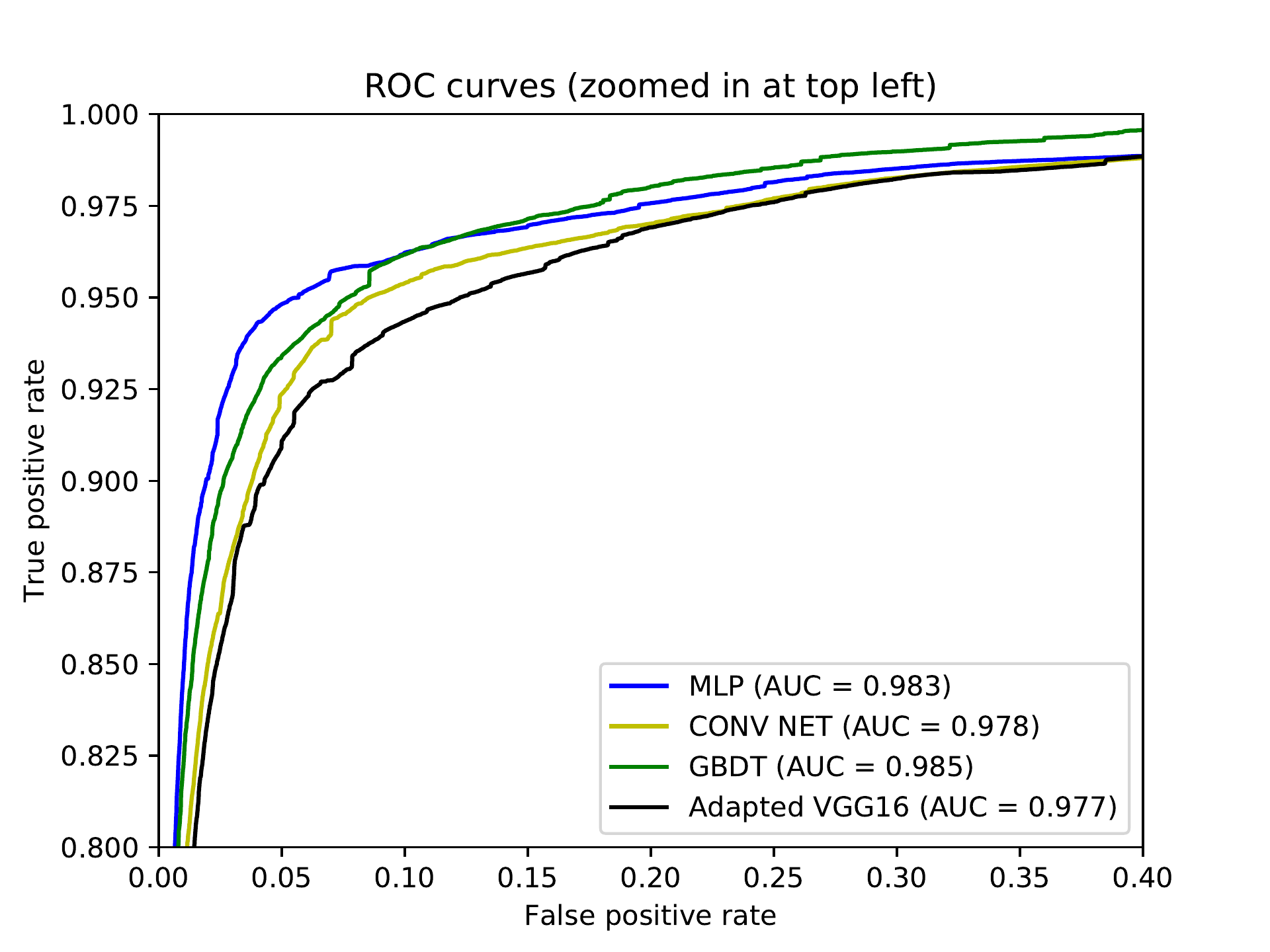 Figures bm and bc show the ROC curves for our trained models. The MLP model has the best ROC up to around 15% FPR, where it is surpassed by the GBDT model. The adapted VGG16 actually has the poorest performance.